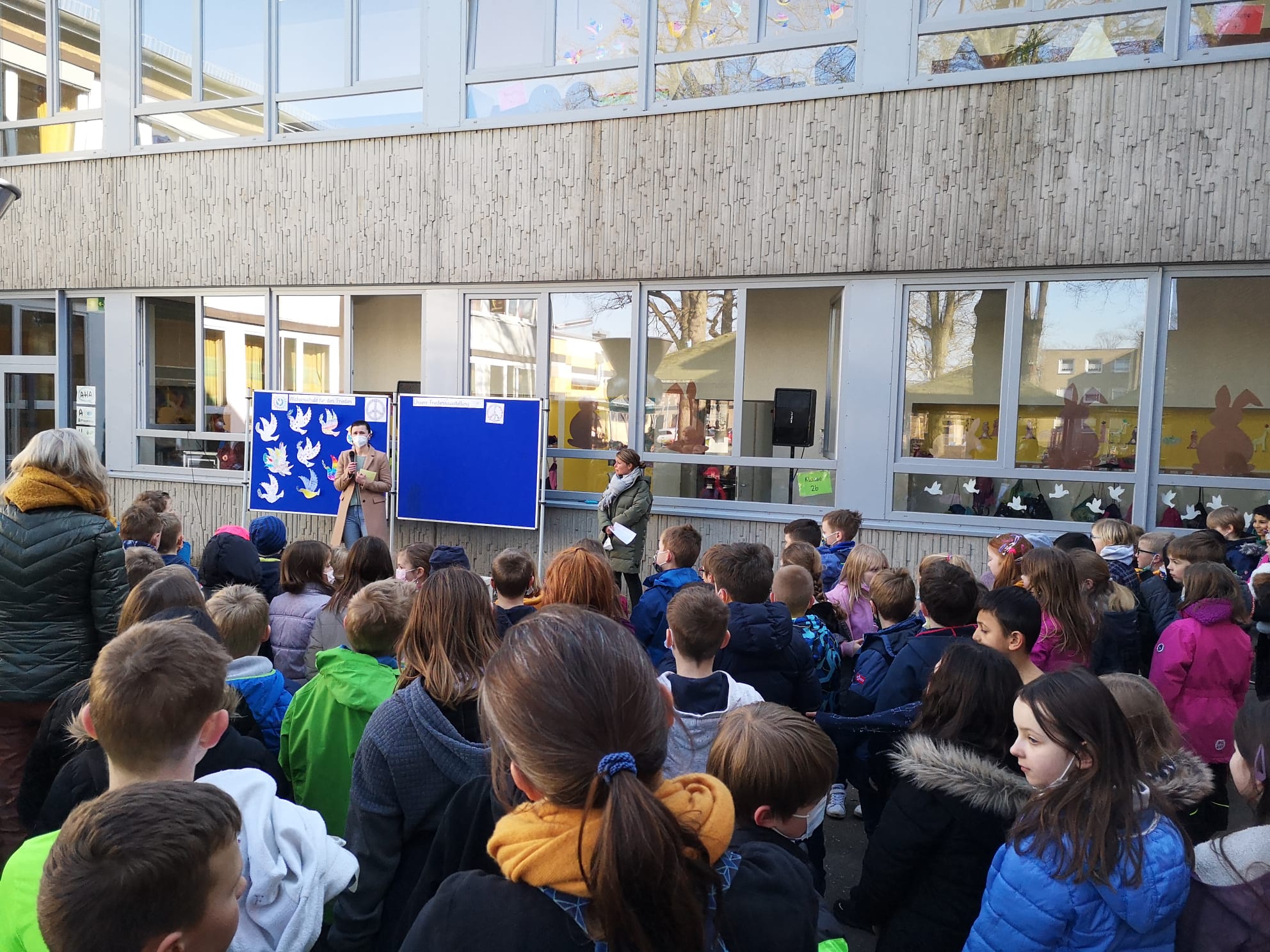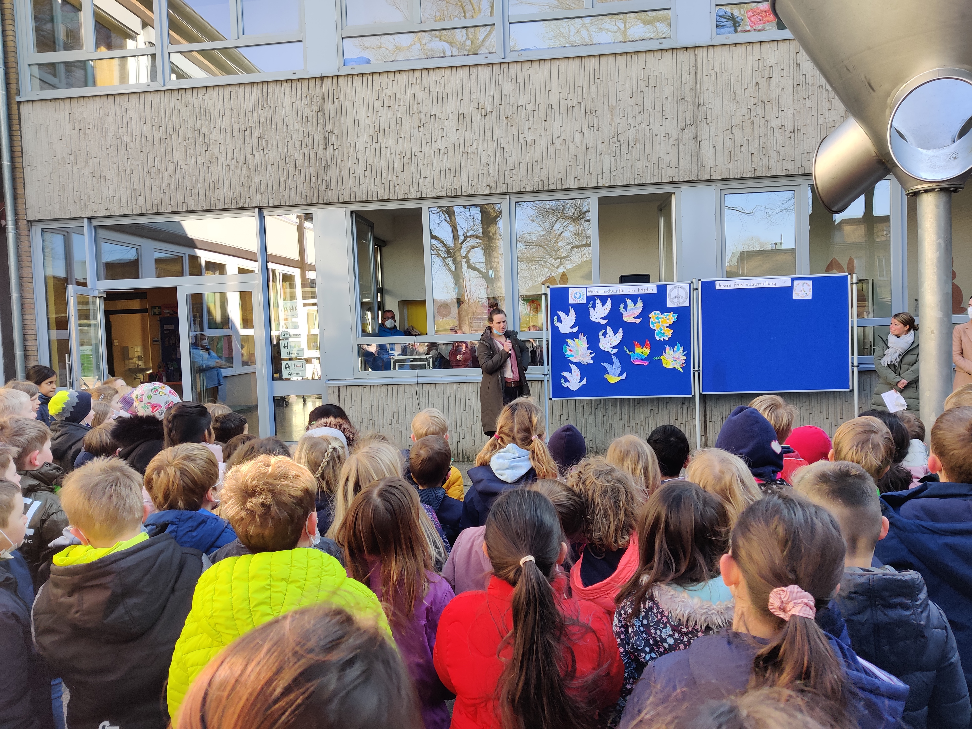 Große gemeinschaftlich gebastelte Friedenstauben landen in der Eingangshalle an der goßen Stellwand, die kleinen sieht man an unseren Fensterscheiben.