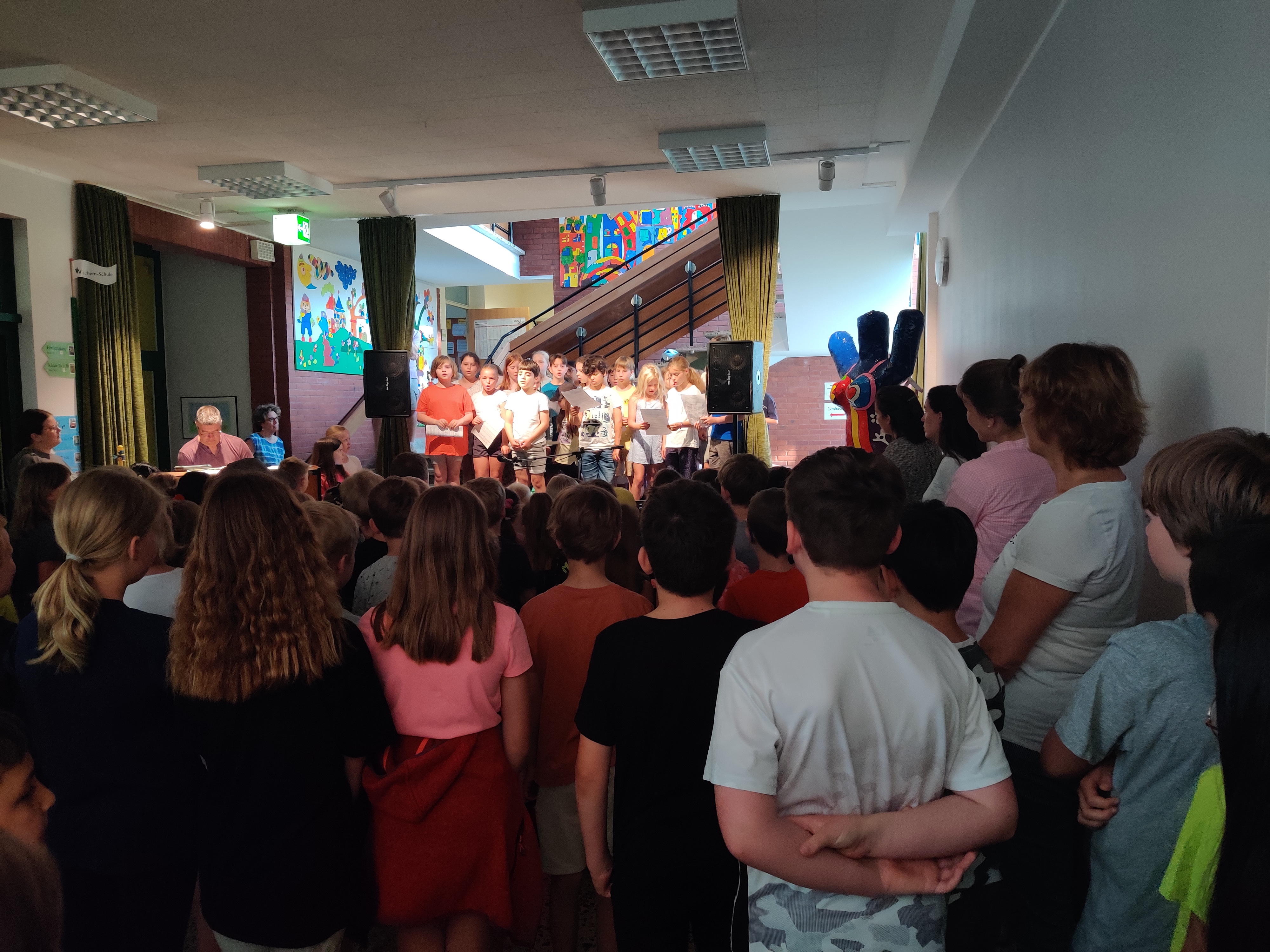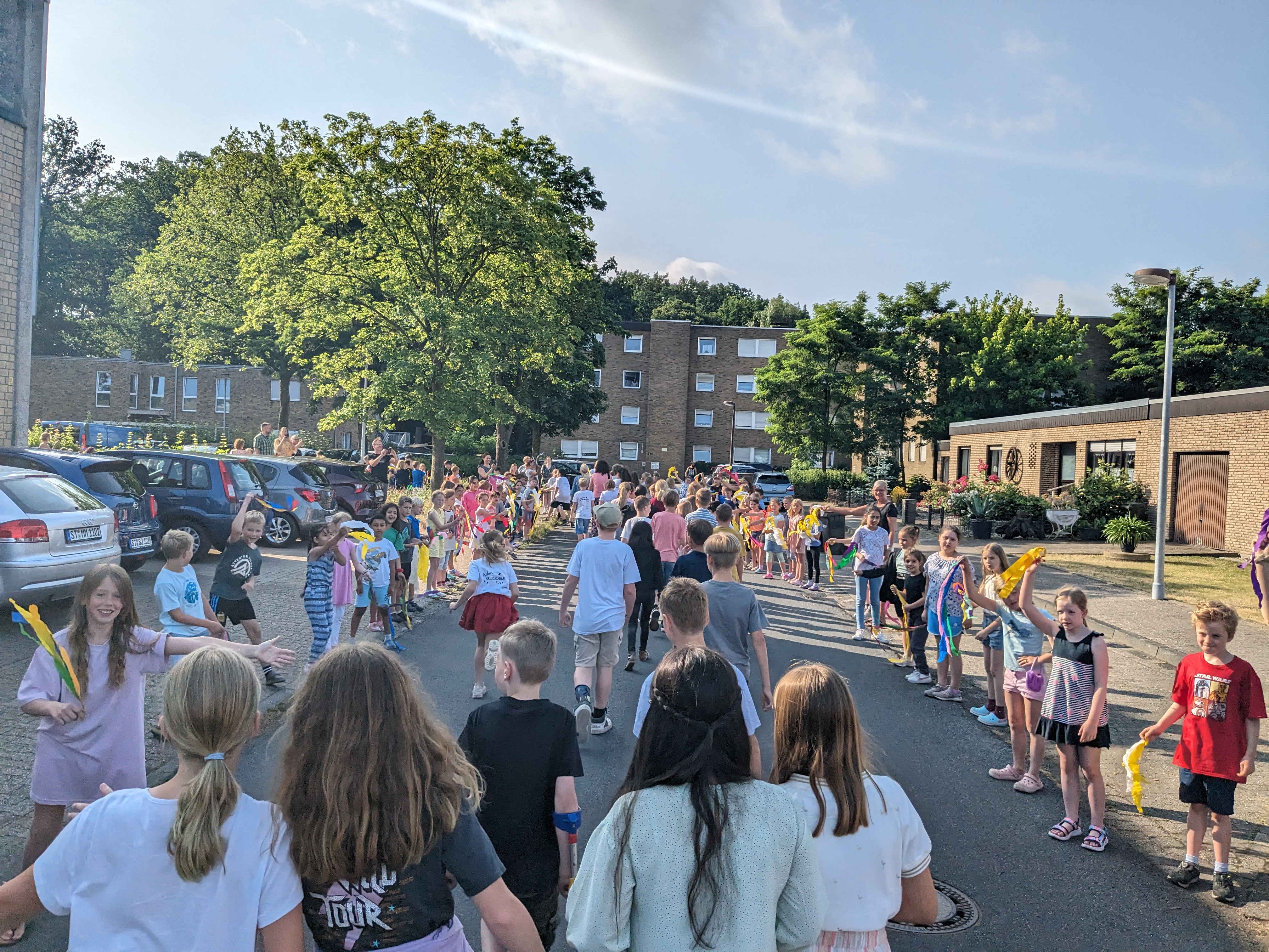 Mit diesem stimmungsvollen Foto vom diesjährigen Sommerschulsingen verabschieden sich die Leher*Innen und Schüler*Innen der Wichernschule in die Sommerferien.