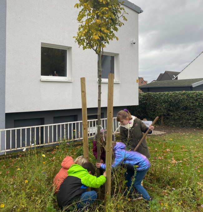 Ein Bienenbaum und eine Blumenesche für die Spenden aus unserem Schulflohmarkt im Mai 2023