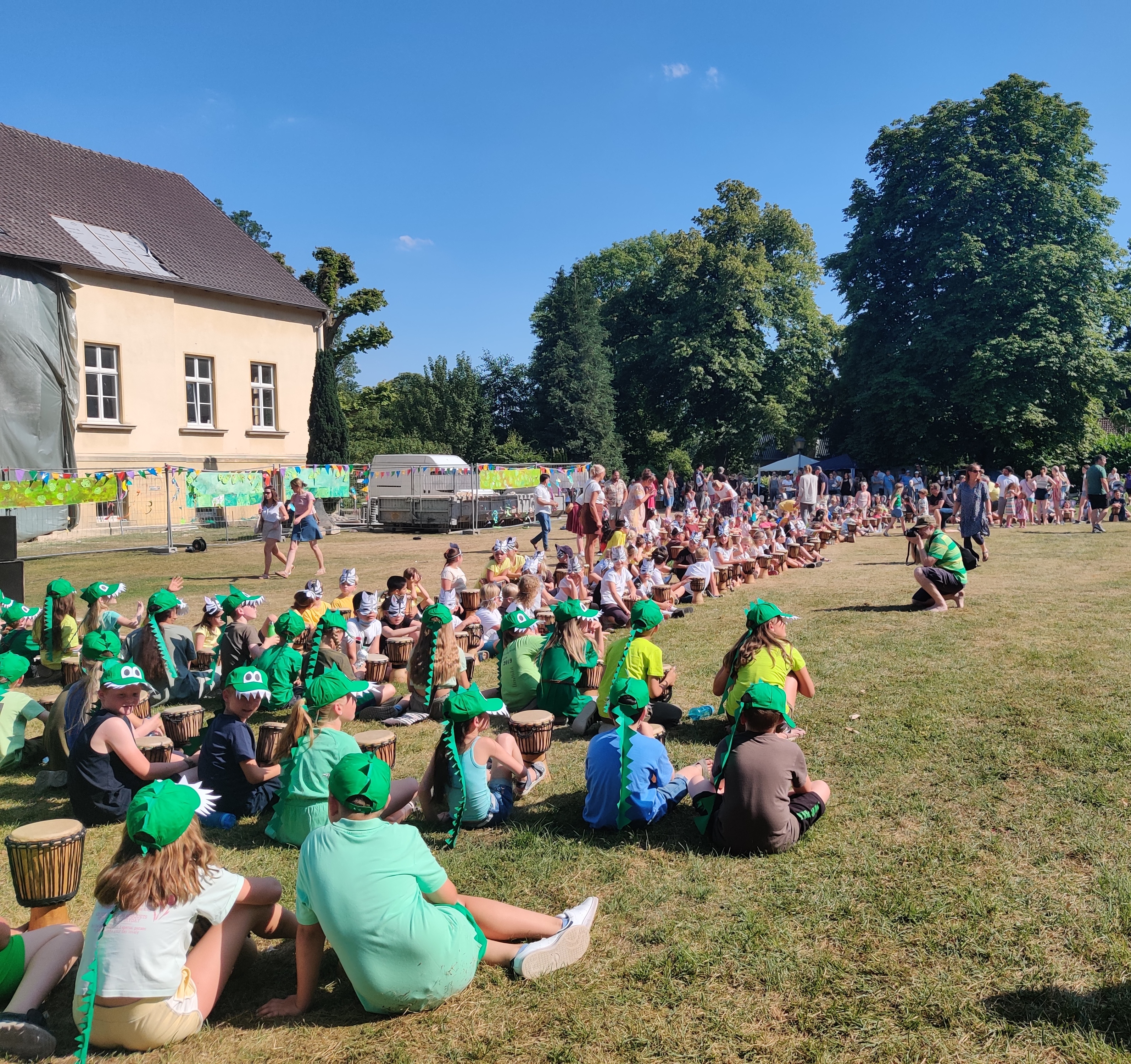 In der letzten Schulwoche findet unsere Trommelzauberwoche statt. Jeden Tag starten alle Kinder gemeinsam in den Trommeltag mit dem Trommelmeister Fallou Sy. Danach proben die Vögel, die Zebras, die Krokodile und die Elefanten einzeln für die große Aufführung am Donnerstag (17h, Bispinghof).
