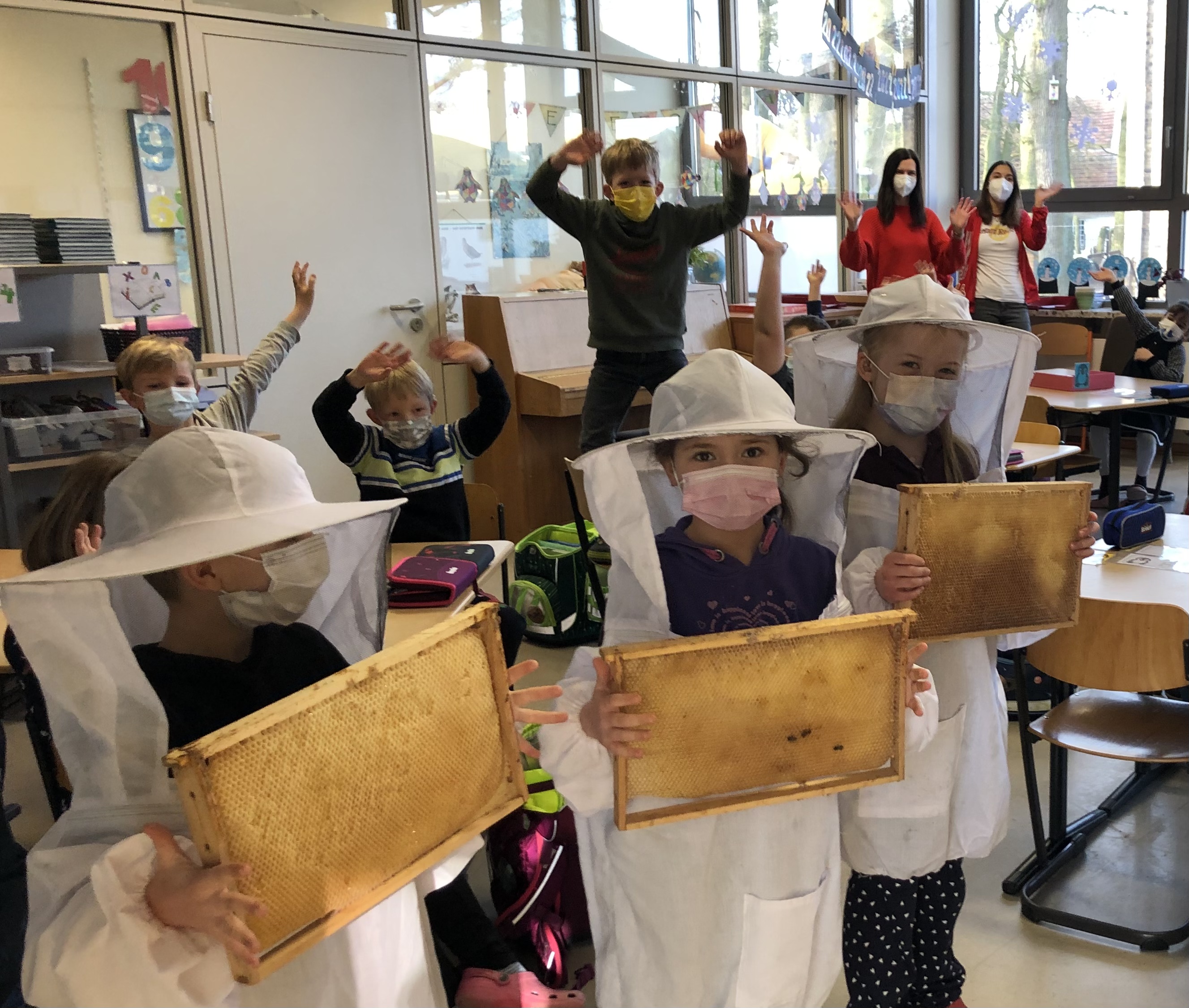 So stiegen die Kinder der Klasse 1c am Dienstag in die von unserem Imker Markus Linnenbaum mitgebrachten Mini-Imkeranzüge und wappneten sich mit Räucherpfeife, Feger, Spachtel und anderem Werkzeug, um die Waben fürs Schleudern vorzubereiten. Die kleinen Imker waren sehr mutig und hatten keine Angst, als sie von den aufgeregten Bienen umkreist wurden. Mit den Bienenwaben ging es dann zum „Entdeckeln“ in die Küche. In der großen Handschleuder durfte jedes Kind einen Teil des wertvollen goldenen „Bienenproduktes“ aus der Wabe schleudern. Das Highlight war die Kostprobe des Honigs, der so frisch und unberührt wie nie gesehen aus der Schleuder in den Eimer floss.