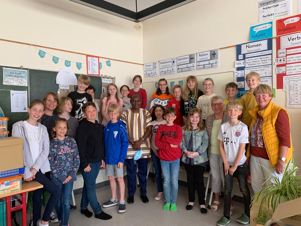 Father Felix kam mit Vertreterinnen vom Freundeskreis Ghana zur Schule und besuchte die Klasse 4a. Die Kinder und Eltern der Klasse spenden den Rest der Klassenkasse für unsere Partnerschule in Yipala und verzichten somit auf das übliche "Abschlusseis". Eine tolle Geste der Mädchen und Jungen!