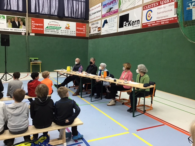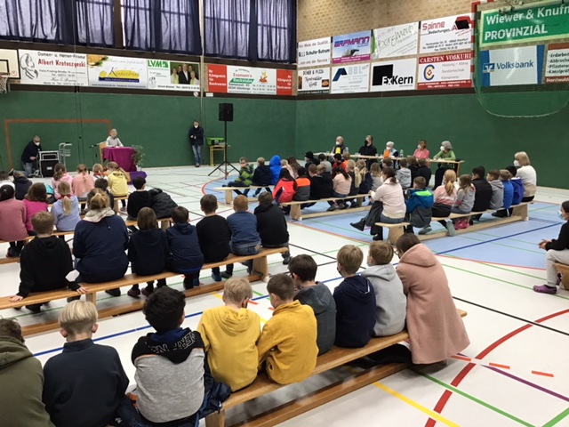 Am Mittwoch vor den Ferien fand der diesjährige Lesewettbewerb statt. Alle Klassensieger und Klassensiegerinnen lasen in der Turnhalle ihre vorbereiteten Texte vor. Alle Dritt- und Viertklässler hörten durchweg aufmerksam zu. In der zweiten Runde lasen die Kinder einen unbekannten Text vor. Die Jury (Herr Böckenfeld, Herr Born, Frau Schilling, Frau Schemann, Frau Pieper-Nathaus) hatten es wahrlich schwer, die Schulsieger zu bestimmen. Letzlich wurden folgende Kinder mit den ersten Plätzen ausgezeichnet und erhielten als Sachpreise einen Buchgutschein: