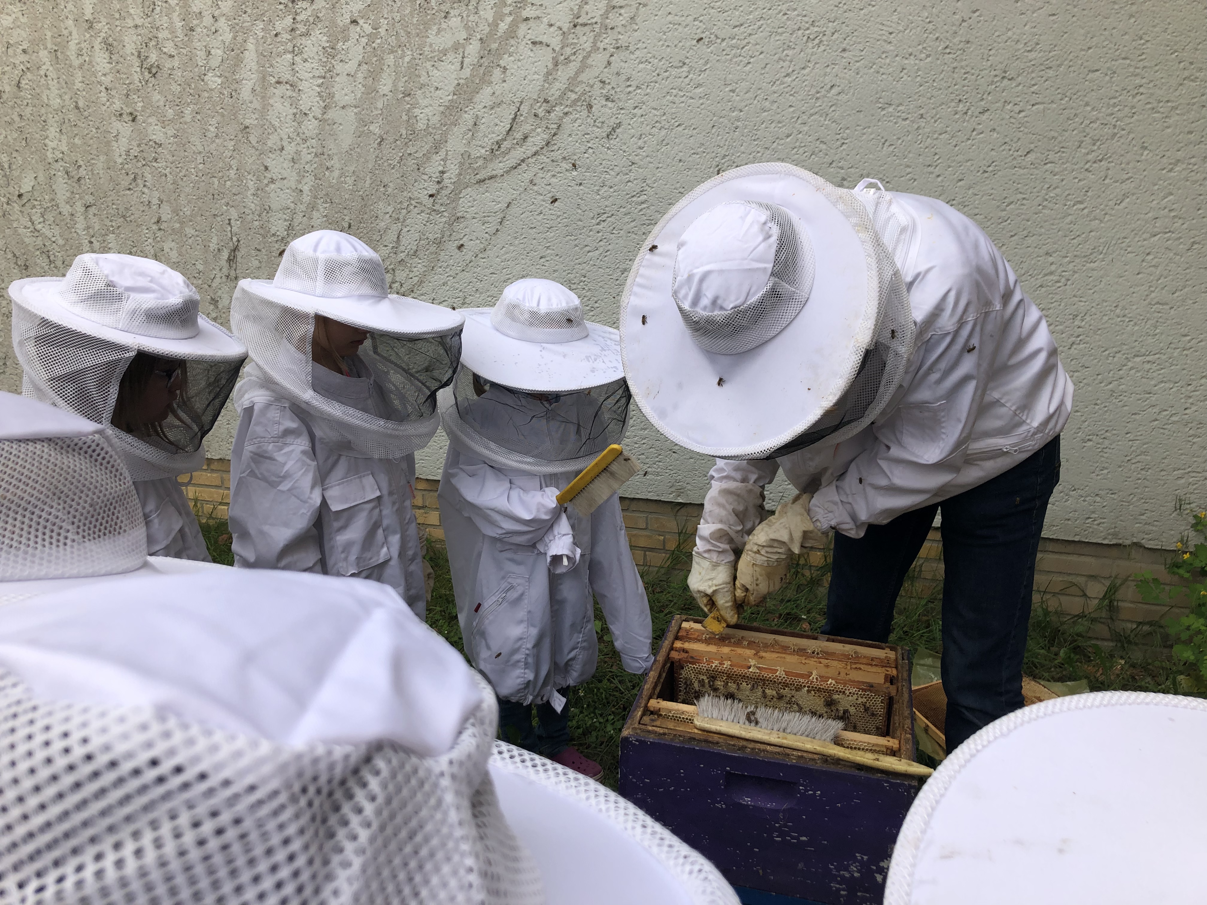 So stiegen die Kinder der Klasse 1c am Dienstag in die von unserem Imker Markus Linnenbaum mitgebrachten Mini-Imkeranzüge und wappneten sich mit Räucherpfeife, Feger, Spachtel und anderem Werkzeug, um die Waben fürs Schleudern vorzubereiten. Die kleinen Imker waren sehr mutig und hatten keine Angst, als sie von den aufgeregten Bienen umkreist wurden. Mit den Bienenwaben ging es dann zum „Entdeckeln“ in die Küche. In der großen Handschleuder durfte jedes Kind einen Teil des wertvollen goldenen „Bienenproduktes“ aus der Wabe schleudern. Das Highlight war die Kostprobe des Honigs, der so frisch und unberührt wie nie gesehen aus der Schleuder in den Eimer floss.